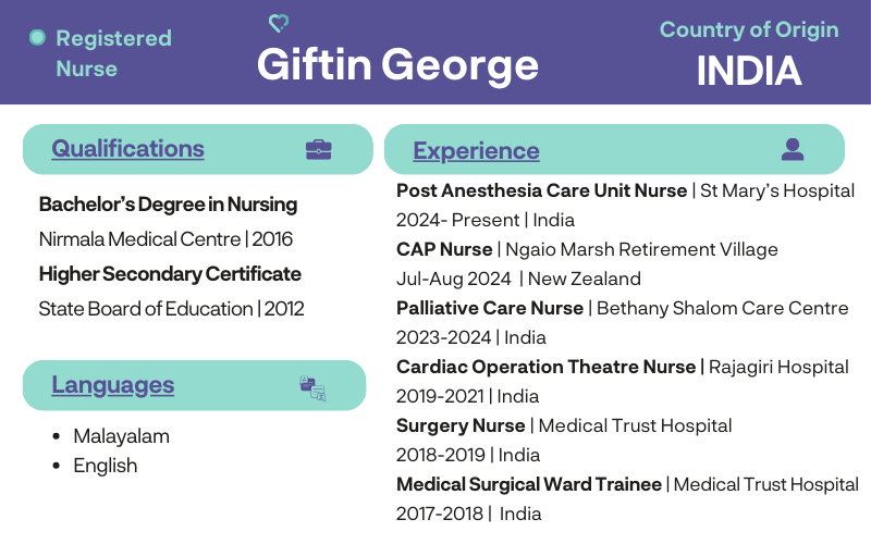 She has a strong foundation in delivering high-quality, compassionate care and excels in managing complex medical and surgical cases. Giftin is a team player who collaborates effectively with healthcare professionals. She is motivated to pursue her nursing career in Australia to gain international exposure and contribute to a world-class healthcare system.